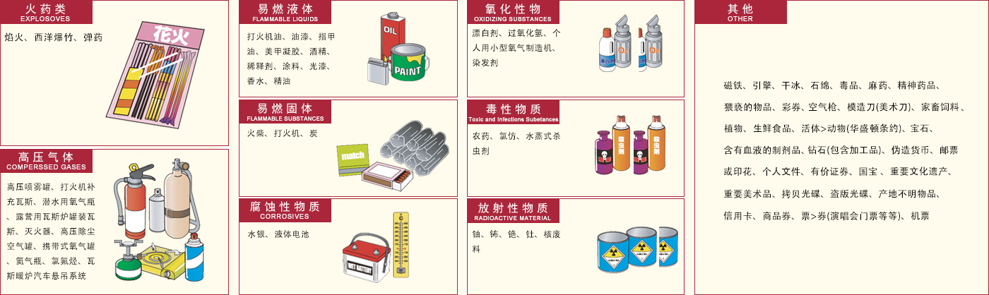 ● 高压易燃气体、液体(包括有泵头的压缩型护肤品、喷雾剂等)